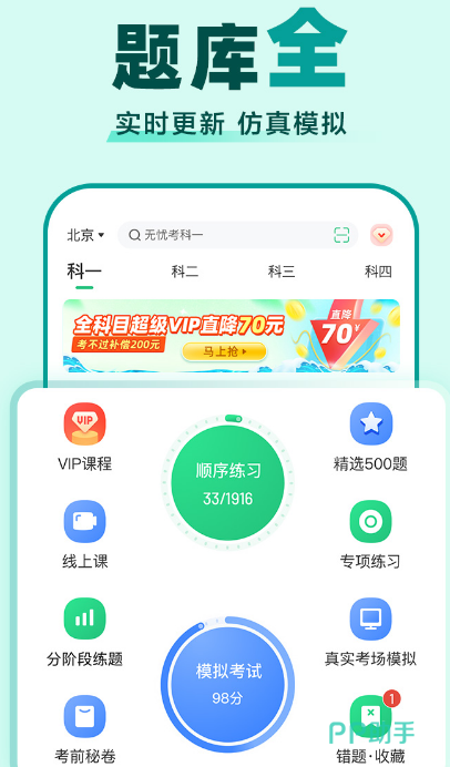 涵盖了驾考服务的核心板块,不仅支持练题,还有科目二、科目三模拟练车视频,从学员报名开始提供一站式的驾考服务,会为用户推送距离家近、口碑好的驾校。覆盖了科目一、科目四国内通用的题库和地方题库,助力用户满分通过考试。如果觉得自己的知识不扎实,可到vip课程中来学习,加深驾考记忆,直播课程为您演示科目二、科目三应该注意的问题,和如何快速通过这两项考试的内容。
