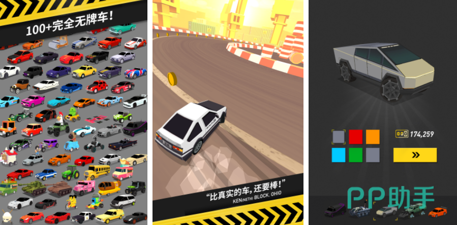 比较喜欢赛车游戏的玩家应该都知道,在比拼速度的时候都会有一些弯道,这些弯道需要依靠玩家漂移才能快速通过,拇指漂移就会设定大量的弯道,玩家可以在上百种不同类型的车辆里面挑选一个自己喜欢的,然后通过比赛锻炼漂移过弯的能力,在这个过程中收集金币还可以用来兑换不同的车辆以及改装颜色和外观。