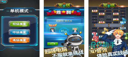 在军棋霸王争夺战中,音效有3D环绕之感,点燃了玩家的胜负欲。在玩法模式方面,玩家可以利用谋略与电脑进行挑战,也可以进行双人对战。在操作方面,玩家可选择顺时针或逆时针进行走棋,而在四国军棋的策略布局下,玩家既可以选择四暗,也可以选择双明,整体的自由度较高。