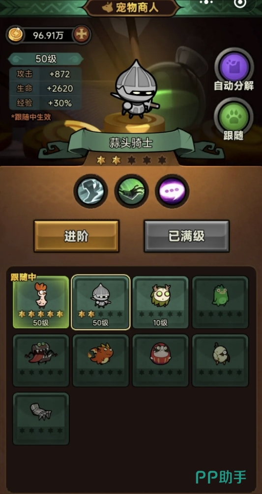 首先为大家推荐的强力宠物是蒜头骑士。他身穿一身骑士盔甲,背负一把长剑,自身有着极高的人气。蒜头骑士的技能名为大步流星,可以提高角色的移动速度以及输出能力。这个宠物强化到最高等级以后,可以为带来百分百伤害加成,十分强力。哪怕是初始等级的蒜头骑士,也能为角色带来百分之十五的增伤,这也是很不错的。很多玩家都会选择带这个宠物,就是看中它的增伤特性。