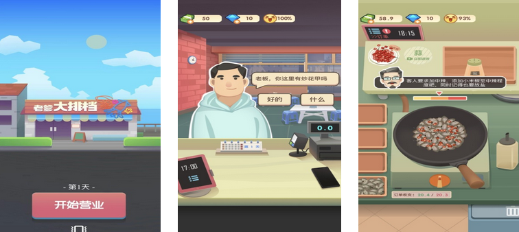 画风清新,大排档的制作环境干净卫生。玩家每天开始营业后,根据顾客的需求完成订单,具体以文字的方式进行告知。食材选用种类颇多,除了羊肉猪肉等烧烤串串之外,玩家也可以制作各类小吃。在制作过程中,物理颠簸设定提高玩家做饭的真实感,满足玩家的小心愿,并且写实风格可以看清楚肉类等食材的新鲜程度,帮助玩家积累日常厨房经验。