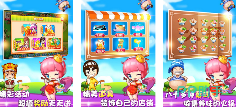 在日式动漫风格中,玩家拥有一家火锅店。菜式高达八十多种,玩家可根据顾客的要求,按照顺序放入火锅食材,成熟之后完成订单。在道具方面,玩家拥有精美的各种厨具等物品,玩家也可以仔细挑选餐厅桌椅等用具。另外,在美食任务方面,玩家可加入精彩活动,通过提高销售额拯救破产的店铺。