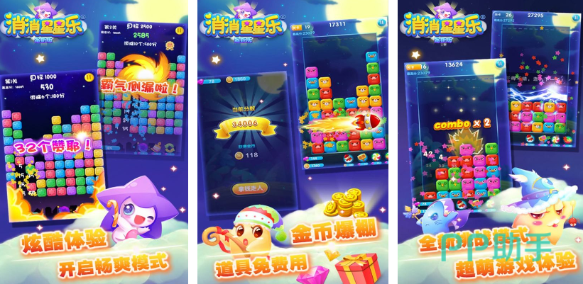 《消消星星乐:最新版》这款游戏虽然主打的是星星,但星星只是镶嵌在方块中的,每个方块上都有不同的星星图案,本质上来说还是方块消除游戏,游戏是闯关模式,只要将相同颜色的方块搬运到一起就可以消除。每次消灭同一颜色的方块,都会有相应的bgm和金币,而这些金币则可以购买道具,增加通过率!
