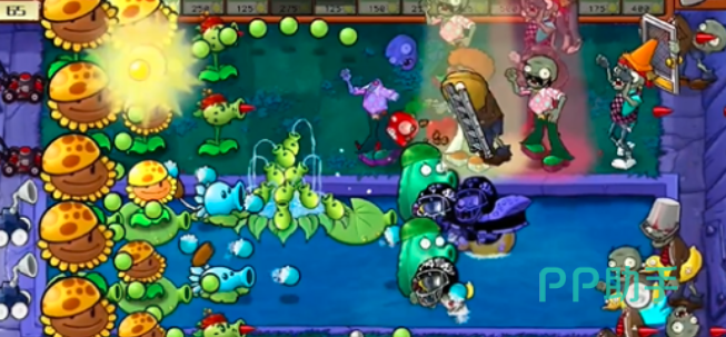 在这里小伙伴们,泳池的武器可以先种一个豌豆许愿树,如果场面上的僵尸太多,大家已经稳定不了这边的话就可以用辣椒炸弹,瞬间清理屏幕上的僵尸。