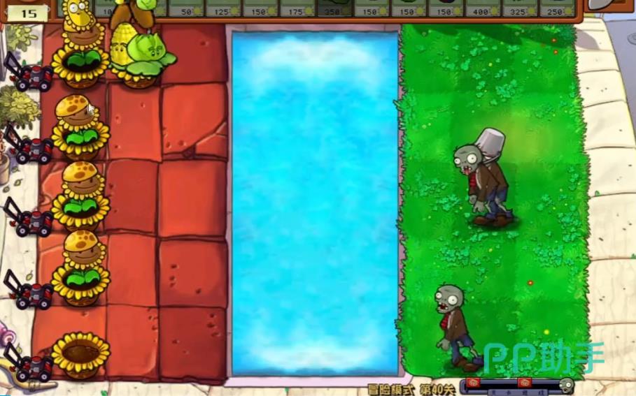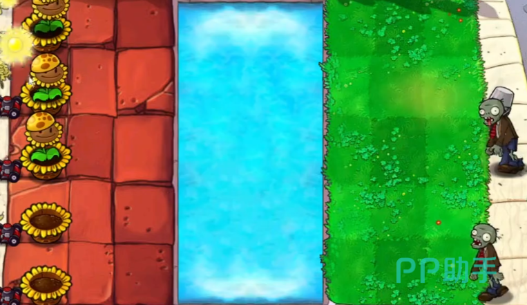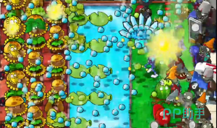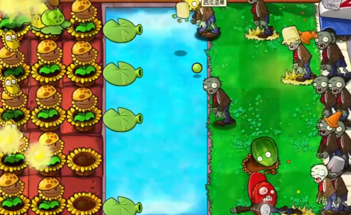 在植物带好了后就可以开始游戏了,开始后大家需要做的第一件事就是先给屋顶场地放满花盆,之后种满向日葵,接下来在有了阳光后需要在水中场地放满荷叶,然后种上两排玉米卷心菜投手和两盘冰冻类植物。
