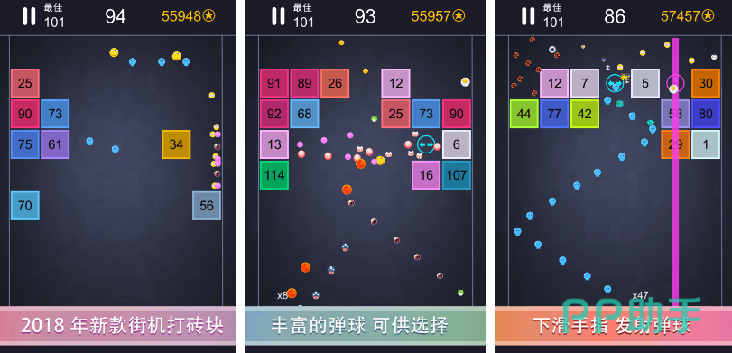 砖块弹球是一款一旦上手就停不下来的弹球游戏,玩家需要发射弹球来打破所有的砖块。游戏的秘诀就是尽量不要让自己的弹珠落地,通过各种角度来让弹球在砖块之间飞行,尽可能每次落地都会击打很多的砖块。当然为了方便玩家们进行游戏,游戏内还设置了多种小道具,有可以让弹珠加快的,也有可以让弹珠分裂的,游戏内一共有几十种弹珠供玩家选择,非常上头有趣。
