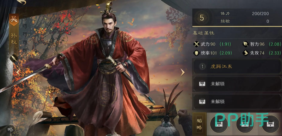 孙权,他的选择就比较多了,主要是根据战场环境与自身战法库来选,只要是主动的战法基本对可以携带,比如说奇门遁甲+上智为间,或者清风驱疾+出其不意。金书可以根据携带的战法来做抉择,比如说用“后主”,紫书选择双主动战法提升,例如机动+励心。装备坐骑方面和周瑜类似,以增伤、特技、特效为主,比如灵光、照影。加点也是智力拉满。