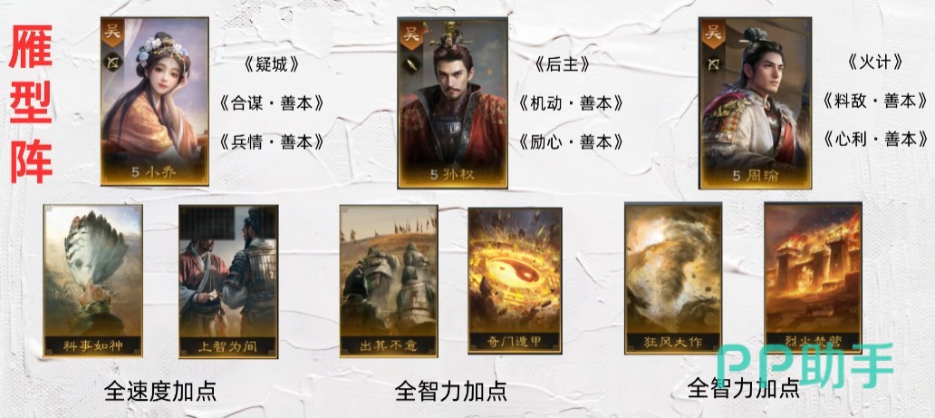 小乔携带“料事如神”和“上智为间”主打控制,因为小乔的速度本身就是非常快的,所以全速度加点抢1速打控制问题不大。如果没有料事如神,那么就选择“趁火打劫”作为下位替代,准备1回合对敌军随机2人造成兵刃和谋虑双伤害,对处于火攻状态的敌人额外施加2回合混乱,因为赤壁弓这套阵容的火攻比较多,所以趁火打劫的控制效率也很不错。