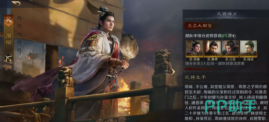 所谓“赤壁弓”自然是以东吴武将为核心的阵容,构成有主C“周瑜”,副C兼辅助“孙权”,然后高速的控制手“小乔”。在小乔刷出金书后自带战法“天香”的发动率基本可以实现全回合给敌人挂虚弱,天克三宝队,抓三宝很舒服,打其他队伍也有四成多的胜率。