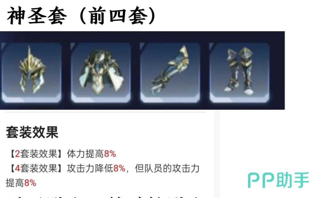 人工制品的熟悉大致可以分为三类,攻击,辅助以及控制,攻击制品提供的效果多为暴击效果,攻击力以及整体伤害等,比如说武装套,这个套装在提升自身百分之5攻击力的时候,还可以额外无视敌方百分之15的护甲,很适合给主c角色使用,另一个套装确切的分析,虽然无法直面提升攻击力,但是可以增强弱点攻击的效率,对于大型boss具有很强的压制作用。