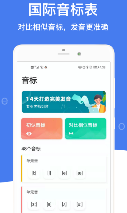 英语正确的发音是很重要的,这款应用就是能帮助用户学习相关内容的,了解正确发音的应用,也是有很多专业人士制作的,可以让用户学习国际音标。即使是零基础,也能帮助自己在英语学习的时候更加简单。具有标准的发音,还有跟读练习的内容。即使自己一开始的发音并不是特别标准,都能提高发音的正确性。