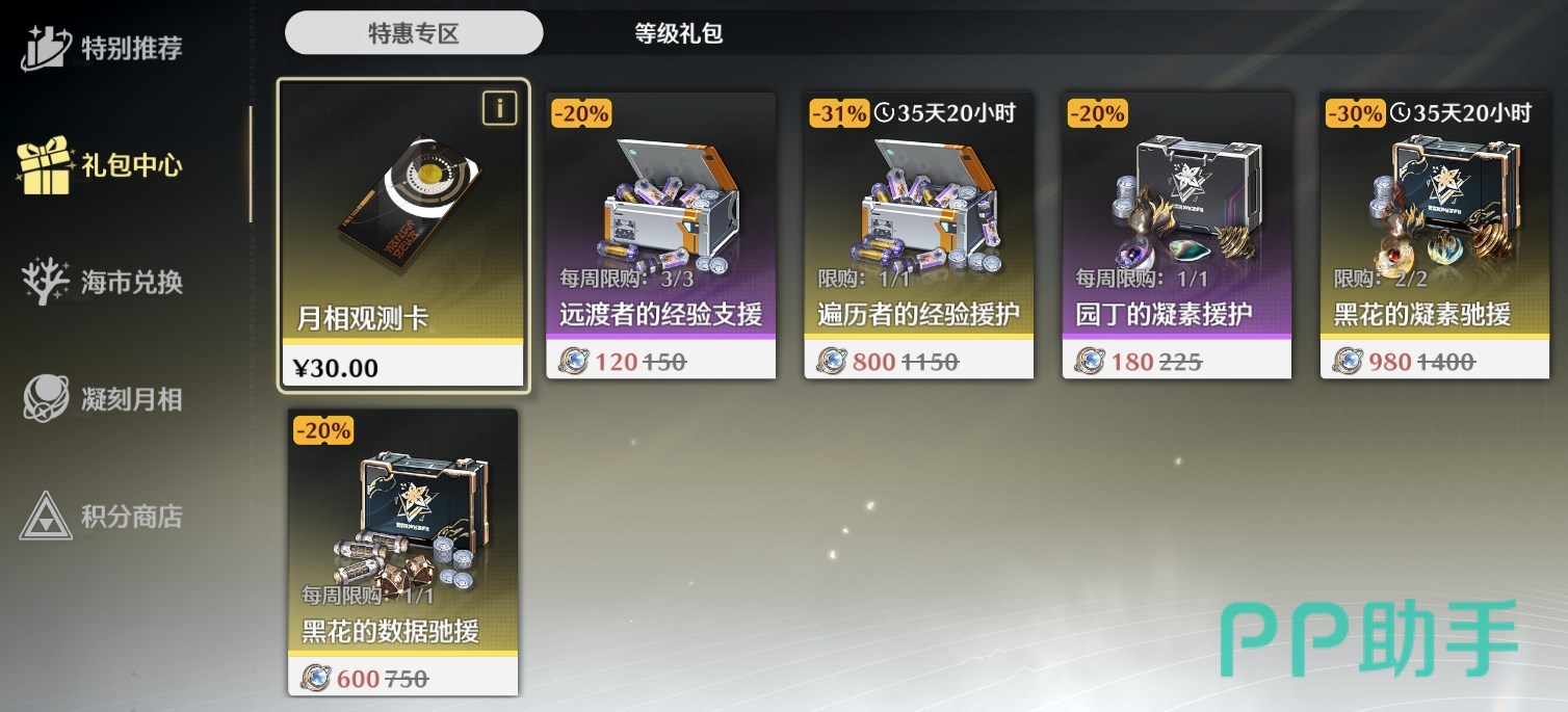 平民氪金的话,首先要氪的自然是月卡,也就是游戏里的“月相观测卡”,只需30元,可以返还等额的300月相,而且单月卡的收益就包含2700星声,合计19抽,这对于打算长期玩这个游戏的玩家来说是性价比极高的。