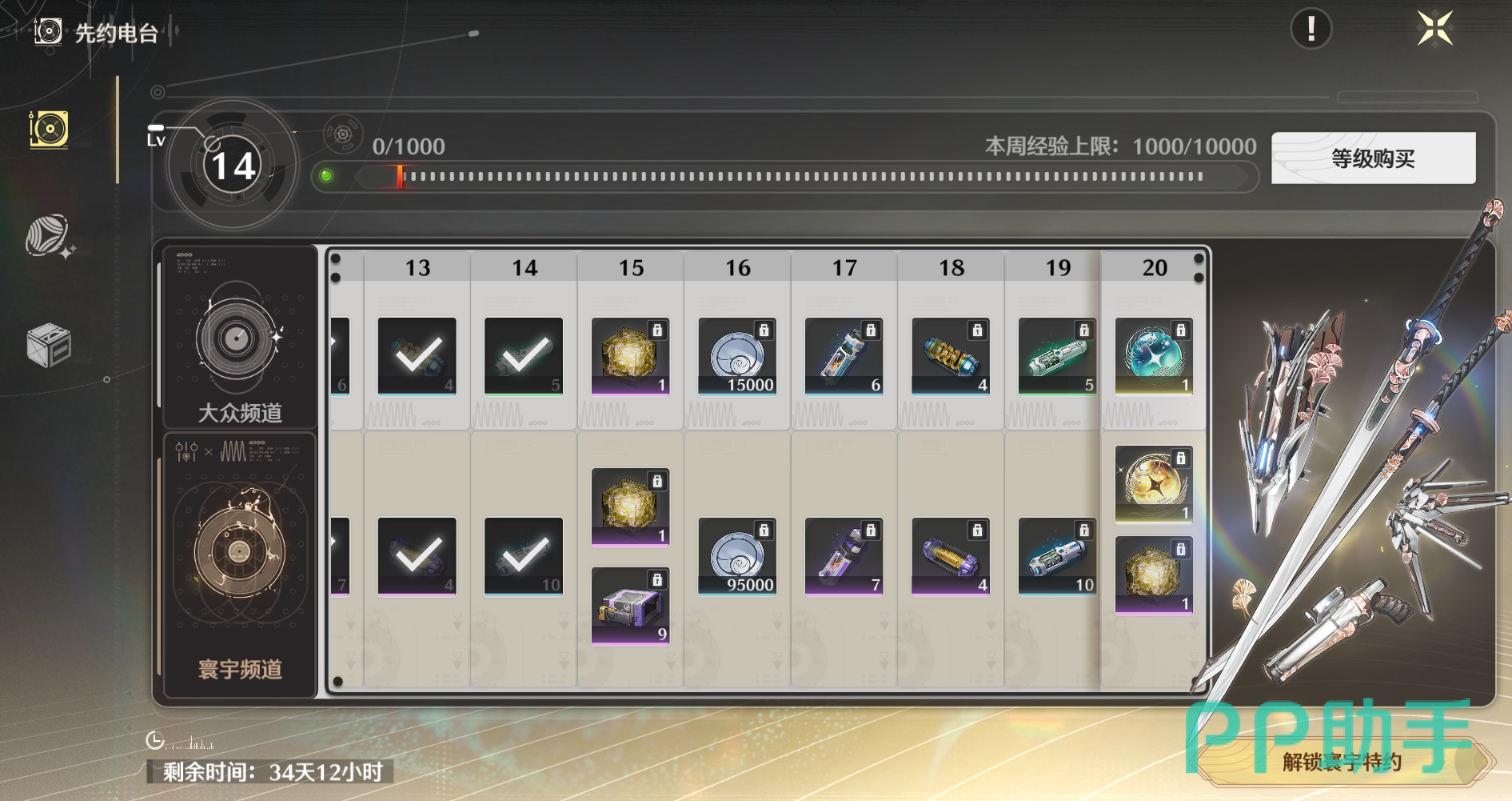 然后是“先约电台”,俗称“大月卡”或者“通行证”。因为在游戏开服阶段资源卡得很紧,大月卡提供的资源还是很关键的,其中最核心的要属“体力”了,大月卡一共可以提供420点体力,前期利用大月卡给到的体力能够快速升级。