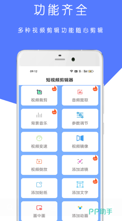 在这款视频剪辑应用里涵盖了海量的素材,即使没有过任何经验的人,都能帮助自己修片子。应用的使用方法特别简单,不过功能却很强大,是炫酷以及配音都可使用的。其中的背景音乐支持很多种类型的,既有柔美的也有动感的音乐,可通过炫酷的片头以及海量的背景音乐,再加上搞笑的表情插入等,让自己完成更好的视频制作,还有很多的特效素材会经常的更新。