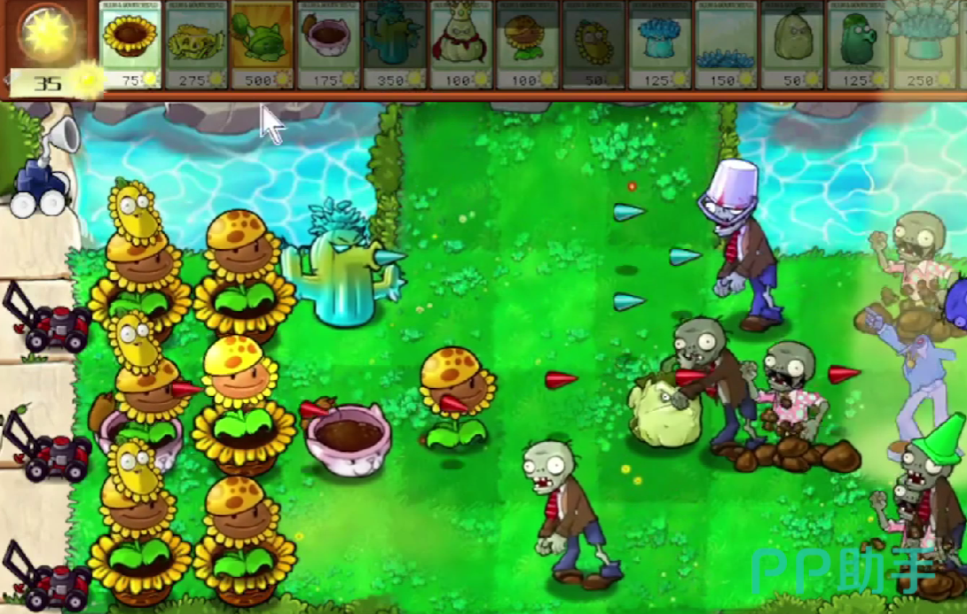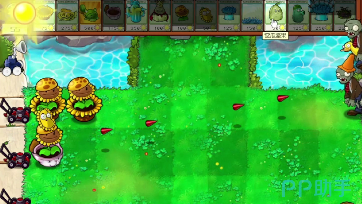 最后玩家在第三排种植【寒冰仙人掌】,寒冰仙人掌可以发射寒冰尖刺,从而让僵尸的速度减缓,如果感觉僵尸的行动速度非常快的话,可以在前排种植倭瓜坚果,这个植物的效果是在血量抵达了0的时候会自动击杀前排的僵尸,可以事半功倍。