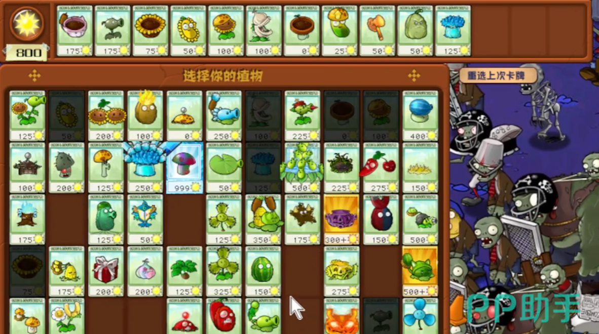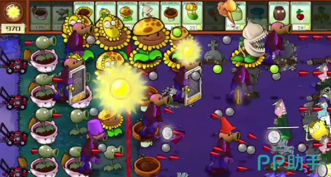 在这一关的植物搭配上,玩家可以选择花盆香蒲、暗夜豌豆射手、向日葵花盆、豌豆荚许愿机、阳光向日葵、大蒜食人花、小喷菇花盆和阳光辣椒、倭瓜、寒冰爆炸菇这一些植物的,如果觉得输出不够还可以携带寒冰豌豆射手和香蒲豌豆射手,首先玩家在场地的最左侧种植好一排阳光向日葵,阳光向日葵种植好之后贴上豌豆荚许愿机。