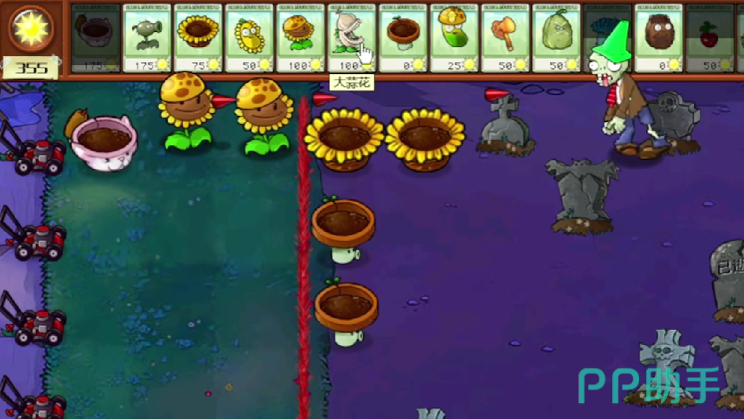 在场地的后面一排种植上花盆香蒲,花盆香蒲可以无视地形进行战斗,并且还能够在夜间正常工作,种植好了之后万斤爱需要在最前方种植好0阳光消耗的花盆小喷菇,小喷菇在前期有一定的战斗力,后期可以替换为阳光向日葵或者替换为大蒜食人花,在最后一排完全种植好花盆香蒲了之后,玩家基本上拥有了一定的战斗力,可以在最前方放上0阳光消耗的坚果用于抵挡僵尸的进攻。
