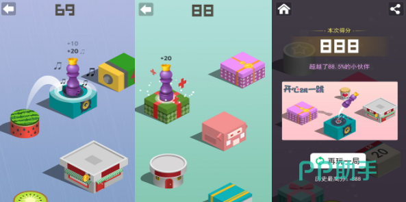 一打开这个游戏,大家就会看到一堆五颜六色的积木随意地堆叠在一起,其中有个小旗子形状的人偶站在离我们最近的那块积木上面。玩家的任务就是操控这个小旗子人偶,通过跳跃的方式不断前进,具体操作很简单,只要按住屏幕进行蓄力,然后一松开手,小人就会飞跃出去。我们按的时间越长,小人就飞得越远,这个游戏没有终点,大家可以一直跳,游戏里还设置了许多特殊的积木,每当我们跳上去的时候,它们都会给大家带来一些小惊喜。