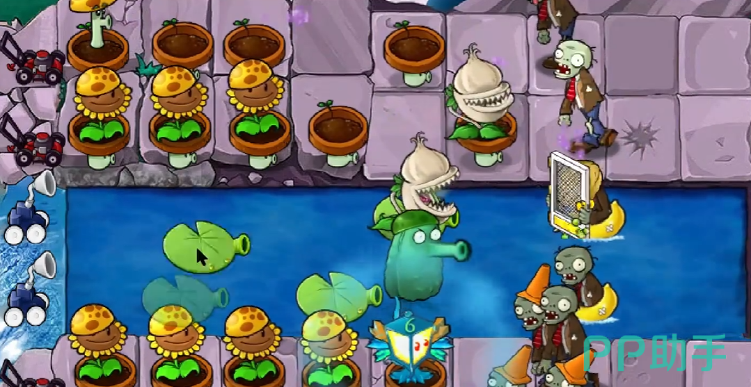 首先小伙伴们需要先放一些向日葵来多获取一些点数,然后可以把莲叶豌豆给放置在水路上,刚开始的时候虽然说敌人的攻击力不强,但是数量还是比较多的,小伙伴们可以把一两个冰冻豌豆给放在中间,这样安排的话,前期这些敌人基本上都没什么问题了。这个关卡给的发育时间还是比较长的,基本上前期出现的敌人都是这些没什么攻击力的,不过由于数量比较多,因此小伙伴们还是不能掉以轻心,并且需要利用好这一段时间来多积累一些资源。