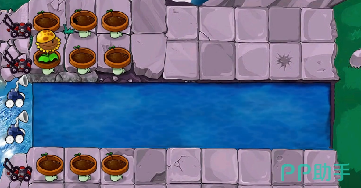 第30关的难点就在于游戏内不仅有陆地还有河流,因此小伙伴们除了要防御陆地上走过来的僵尸之外,也要格外注意水里的僵尸,所以在游戏的开局,伙伴们选择这一关携带植物的时候,除了要携带可以在陆地上作战的植物,也需要挑选一些可以放在水里的植物。不过同时这一关也为小伙伴们在每条路上都配备了三个盆栽菇,它可以使得战斗力提升哦。
