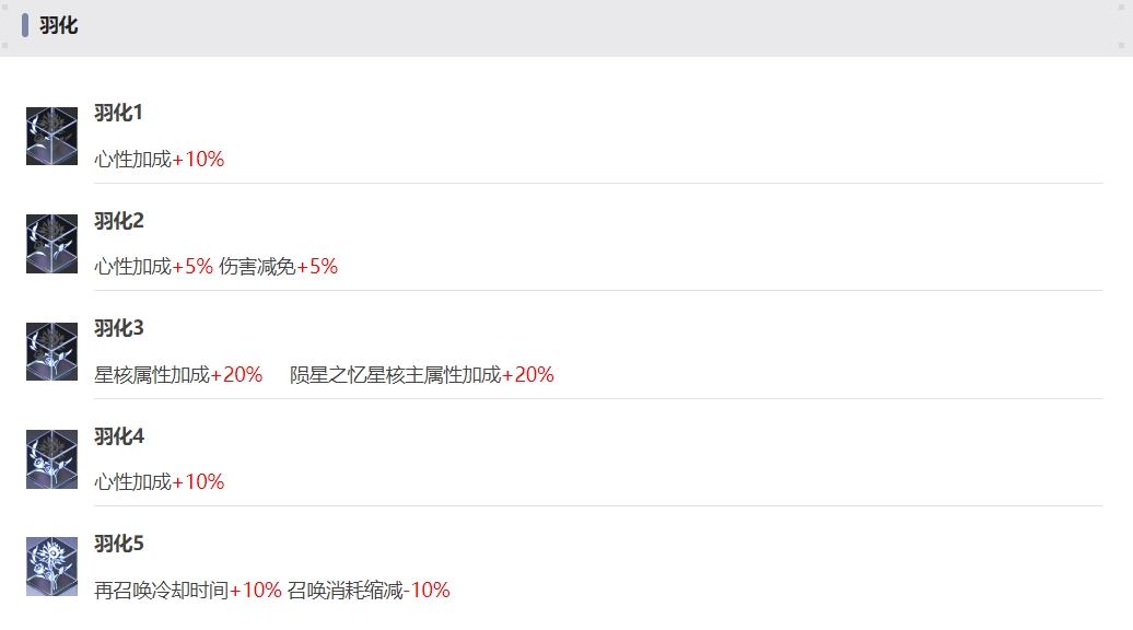 天夜的羽化共5个,羽化1是心性将有10%的加成,羽化2是心性加成5%之外还附加5%的伤害减免,羽化3是星核的属性有提供加成20%,陨星之忆的星核主属性加20%,羽化4提供心性加成10%,羽化5可以再召唤冷却时间10%,召唤消耗月髓缩减10%,以上就是对于咏月风雅天夜介绍的内容了,希望对大家有帮助。
