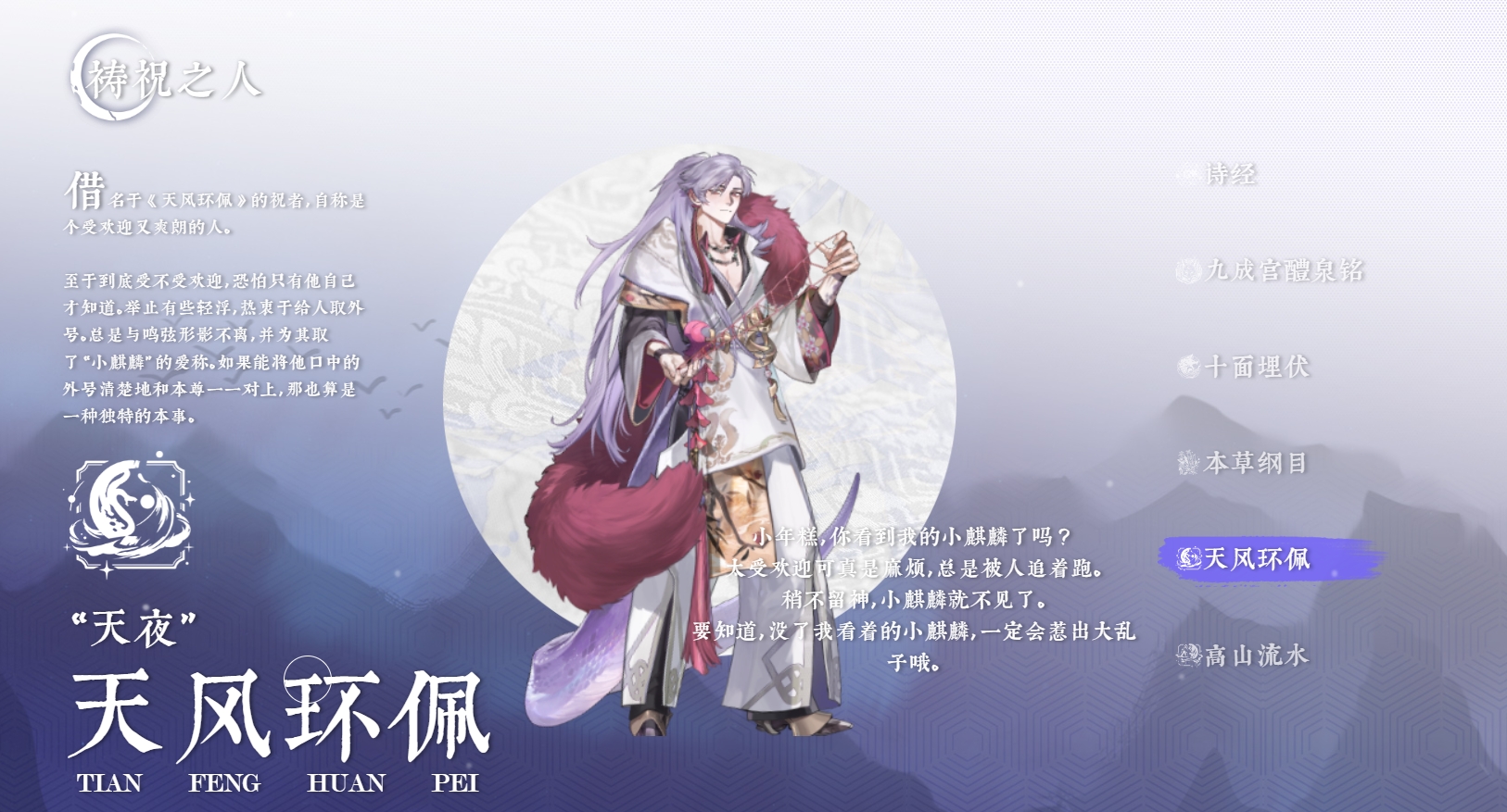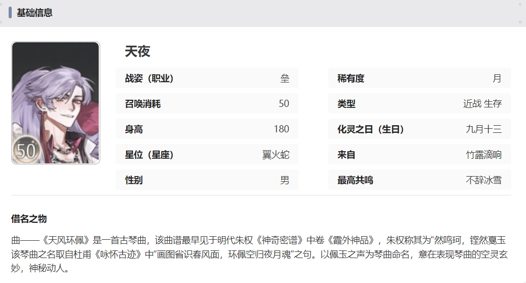 天夜的借名之物是曲,一首古琴曲《天风环佩》,他属于近战英雄,因此他的攻击距离是近的且他的攻击间隔快,作战是可以安排作为前排去打,同时他含有150%的暴击伤害,攻击76点,输出不算太高。