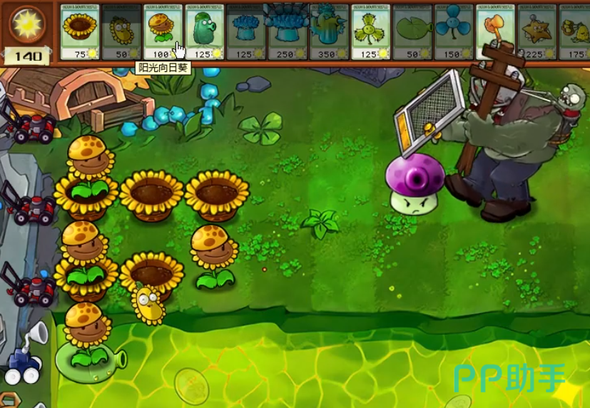 游戏开始之后,玩家可以先往场景里放置一些阳光花盆和阳光向日葵,这是为了增加阳光的产出,等他阳光的数量足够之后就可以往水池里放置荷叶,荷叶还融合了豌豆射手的作用,既能承载其他的植物,也可以对僵尸攻击,在种植的过程中,需要遵守阳光向日葵在最里侧的原则,后外侧可以放置上玉米投手以及蘑菇,一旦有僵尸触碰到这些蘑菇,那这些僵尸就会被迫后退两格左右的距离。