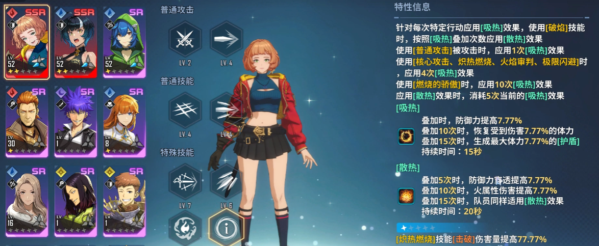 要为玩家们推荐的第一位T0角色是SSR猎人,艾玛罗兰,她也是目前我独自升级崛起游戏中除了主人公之外登场使用率最高的一名猎人角色。她的技能多为大范围AOE技能,伤害数值非常可观,而且伤害具有击破效果,在面对一些类似于耶格利特这样的高护盾BOSS时,艾玛罗兰的击破效果可以帮助队伍更加快速地破盾,对BOSS造成有效伤害。她的推荐属性是体力以及防御穿透力,伤害为火属性,推荐属性可以帮助玩家们在对艾玛罗兰进行养成时更好地选择加点属性,对装备的选择方向也有了大致路线。艾玛罗兰技能中的【吸热】和【散热】两个效果与她的技能互相搭配,机制非常完善,几乎每套连招都可以触发技能带来的额外增伤效果。
