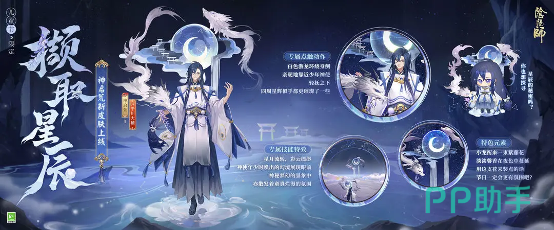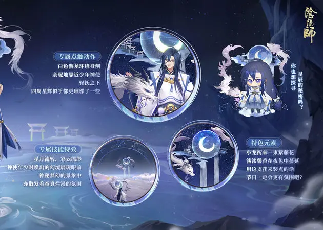 在点处的时候会有白色的游龙环绕在大家身侧,此时神启荒会抬手轻轻抚摸。他的专属技能特效有星云流转和彩云飘渺的效果,神使少年会召唤出幻境展示在大家面前,皮肤还有专属的星月特色,整体看下来是比较精致华美的,看起来很儒雅,妥妥一个国风美少年。