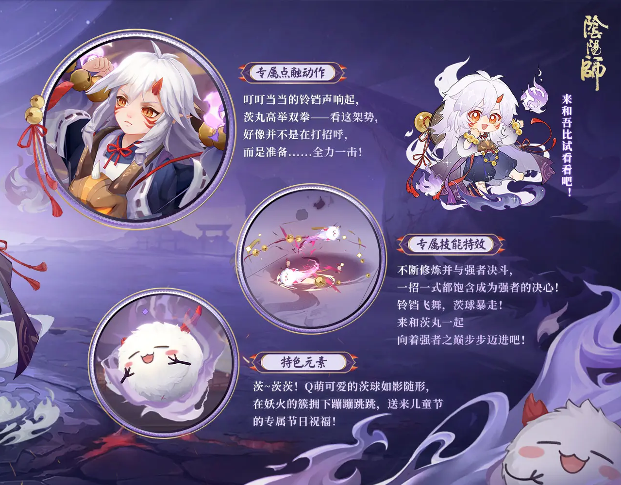 第二款是炼狱茨木童子的皮肤,茨丸出击,这一款的皮肤有点像小捣蛋的感觉,茨木童子本身就是一个很可爱的小孩儿形象,整个画报设计也是偏向于可爱系的,同时还加上了小幽灵的元素。同样的也拥有专属的点触动作以及特效,触发点触的时候,茨木童子会高举双拳,技能特效则是铃铛飞舞。