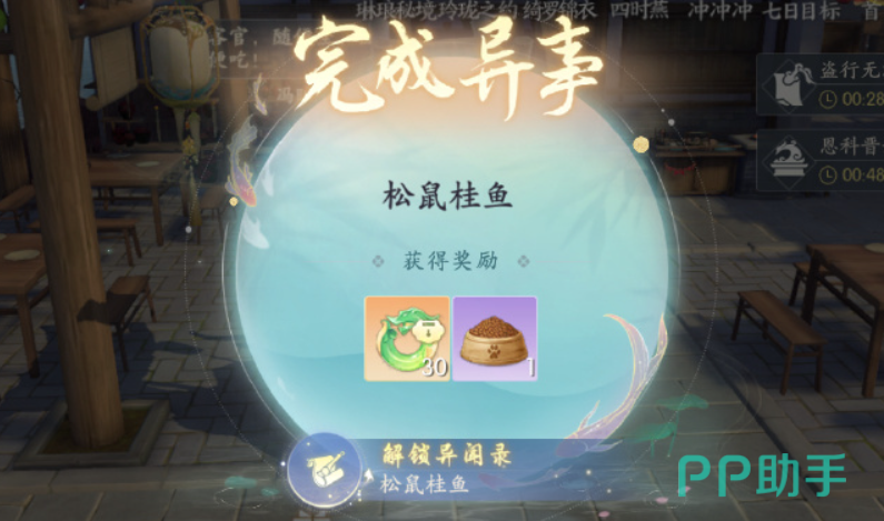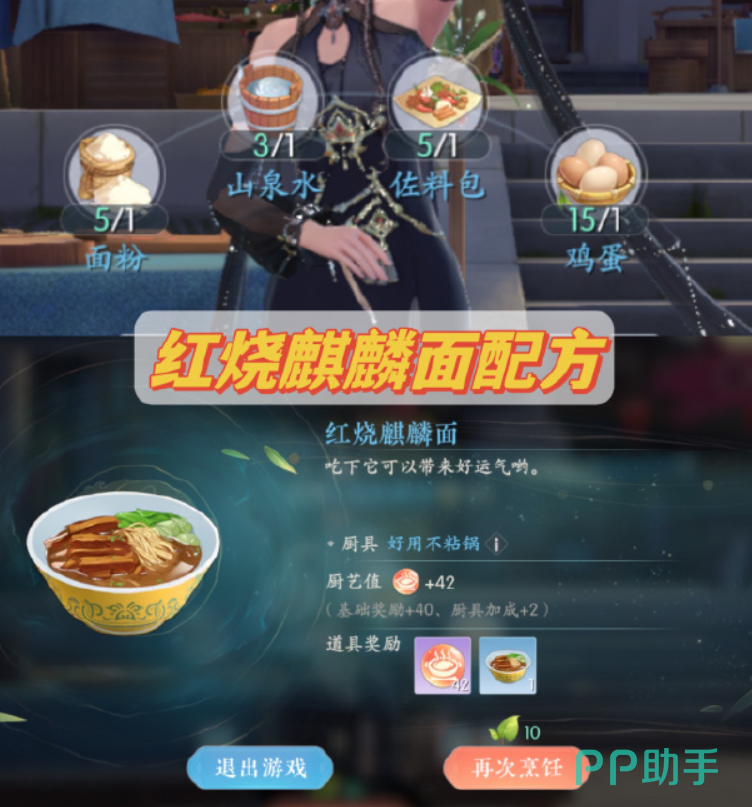 使用面粉,山泉水,佐料包和鸡蛋,大家就可以成功研发出来【红烧麒麟面】的菜谱了。成功完成《浮生忆玲珑》中的松鼠桂鱼任务后,玩家将会获得珍贵的松鼠桂鱼配方。除此之外,作为额外的奖励,元大厨还会慷慨地将红烧麒麟面的配方赠送给玩家,供玩家自由制作。