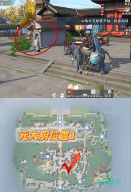 接着我们来到图上的位置,元大厨就在戏台的旁边,还是比较显眼的,和他进行对话继续任务。