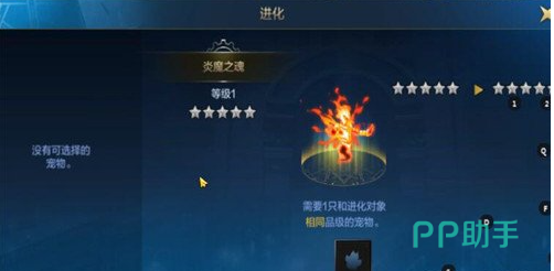 玩家仅仅只需要点击这两个字,立马就可以跳转到一个新的界面,这里就是进化的界面。宠物在进化过程中所需要的原材料到底是什么呢?其实就是相同的宠物。例如炎魔之魂想要从一星提升到二星,必然就应该准备三个一星的宠物作为材料。根据这一种进化的方式,很多的玩家都会发现在进化的过程中还是有难度的,特别是一些本来就比较稀有的宠物。因此如果并非是土豪,就建议大家不要选择这种方式。就算要选择进化,也不要选择那些史诗级别。