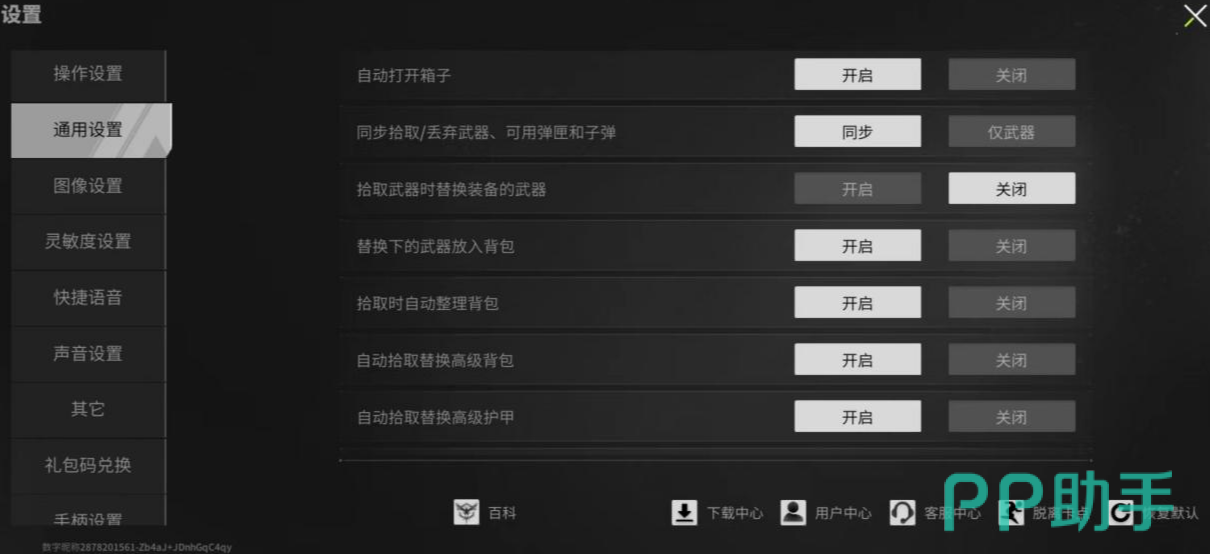 再来看一下通用设置,在拾取范围这里可以关掉两个选项,这样可以避免在战斗中因为自动替换装备而手忙脚乱。但是,大家可以打开自动替换更高级的背包和护甲的选项,这样我们的防御装备会自动升级到最好的状态。游戏中的各种功能开关虽然有些看起来很便捷,但并非都适合我们,比如说那个自动开门功能,听起来好像很方便,但实际上,每次开门都会发出响声,这不就等于告诉别人我在这里吗?所以,这个功能还是关了吧。