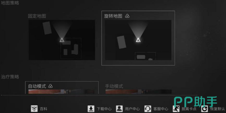 静步这个功能保持默认设置挺好的,预警震动和声纹显示这些都建议打开,在真实的战斗中,它们能帮大家更快地做出反应。再来说说策略设置,地图策略方面大家可以选旋转地图就挺不错的。至于治疗策略,新手们可以先选择自动,等后期对游戏更熟悉了,再换成自己喜欢的方式。