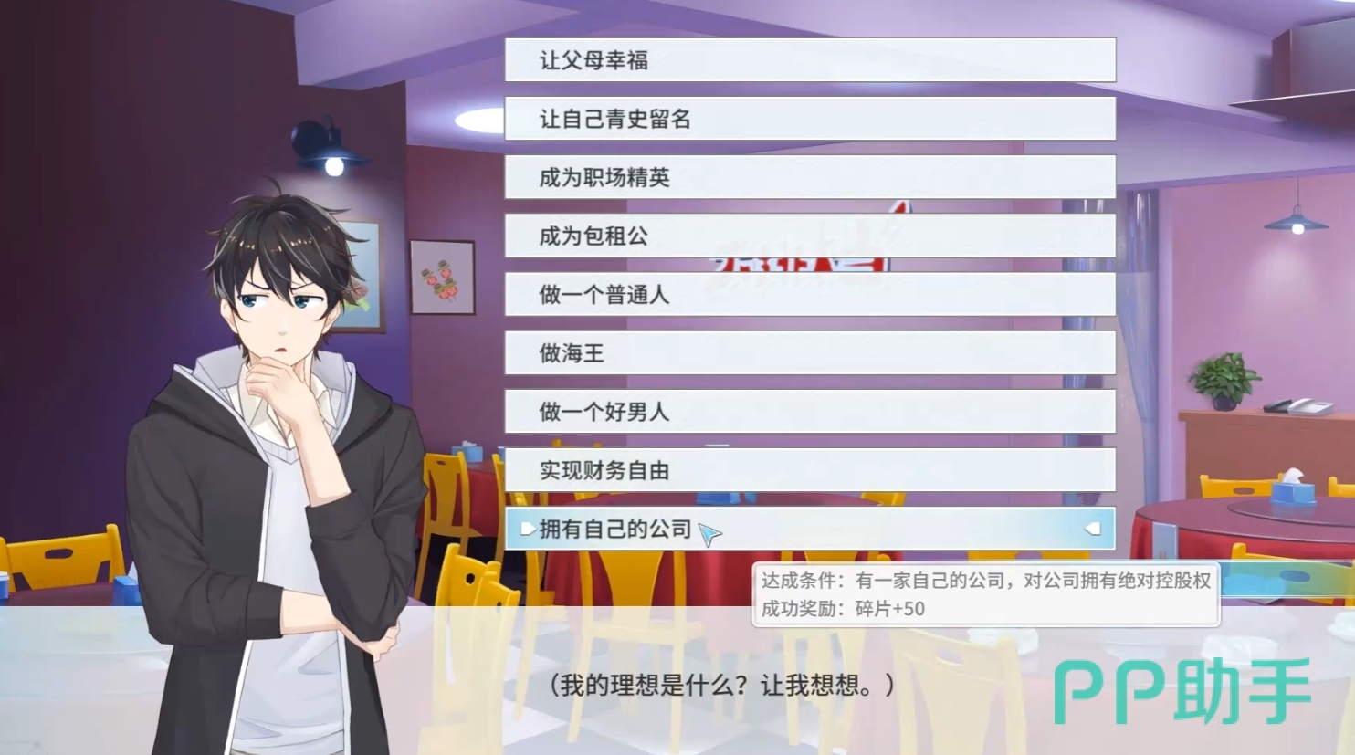目前游戏内的理想一共分为9个,分别是让父母幸福,让自己青史留名,成为职场精英,成为包租公,做一个普通人,做海王,做一个好男人,实现财务自由,拥有自己的公司。这些理想对应的达成条件都是不一样的,相对而言,成功奖励也会有所差别,下面将分别介绍一下: