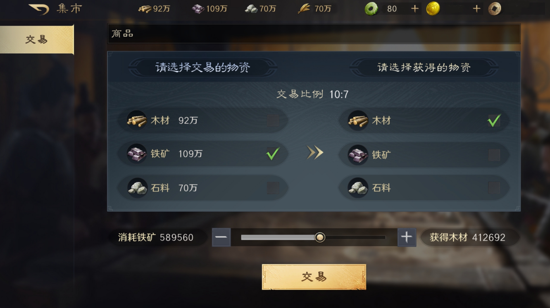 此外,铁矿也可用来交易和兑换资源。玩家们可前往日常商店里,用铁矿来兑换铜钱,是前期缺铜钱时重要的补充手段。同时也可与其它君主进行交易,但最好在自身铁矿资源较为富裕时再使用这个方法,且最好找同盟交易。