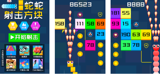 控制贪吃蛇射中更多的方块消除,每一块方块上面都有对应的数字,只需要射出对应的子弹数量才能够把全部方块消除,射击速度会随着闯关逐渐加快,游戏过程中还有道具磁铁以及雪花的使用,使用道具能够帮你延长贪吃蛇碰到方块的时间,在回合结束之前获得更多的分数,游戏还有排行榜,你能够在通关后查看自己的真实实力。