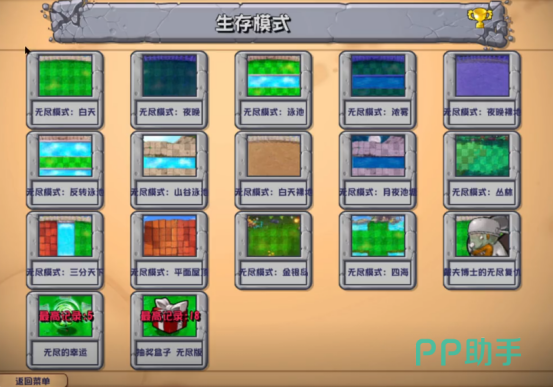 植物大战僵尸杂交版生存模式一共是有17个关卡,大家在下面这张图片中也可以看到这些关卡到底是什么。其实这些关卡是一轮比一轮困难,游戏中的场景也是非常多的,不同的关卡中出现的僵尸种类也不一样,大家必须要依靠自己的智慧,把这些僵尸抵挡住,还要利用各种植物,毕竟植物才是游戏中最主要的抵挡物。