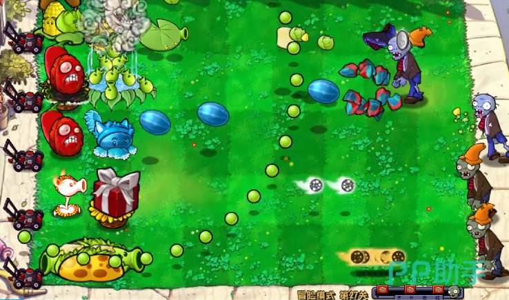 等有了足够的阳光,就在中排放上高坚果来当防御,等能量花的冷却时间一过立马就种,然后把得到的能量豆加到双胞向日葵身上,紧接着就种上冰西瓜,让那些僵尸减减速。等到两排都种满了双胞向日葵,一排高坚果也布好了防线,再配上冰西瓜,防御就稳固多了。如果遇到一群喷射器僵尸冲过来,就用三叶草一吹,他们就都没影了,到了游戏后期,僵尸多得吓人,想不丢车几乎是不可能的。所以,大家可以撑到最后一波僵尸出现,然后直接放弃抵抗,让小推车来个大扫荡,这样也能过关。