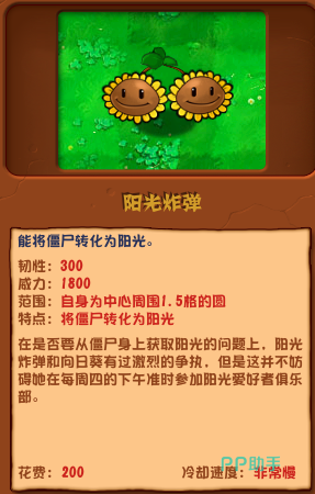 说到这个阳光炸弹,它的效果可是很给力的,这个植物可是个宝贝。它每隔25秒就能产生15点阳光,挺有用的,而且,等它长了90秒后,产生的阳光还会提升到25点。