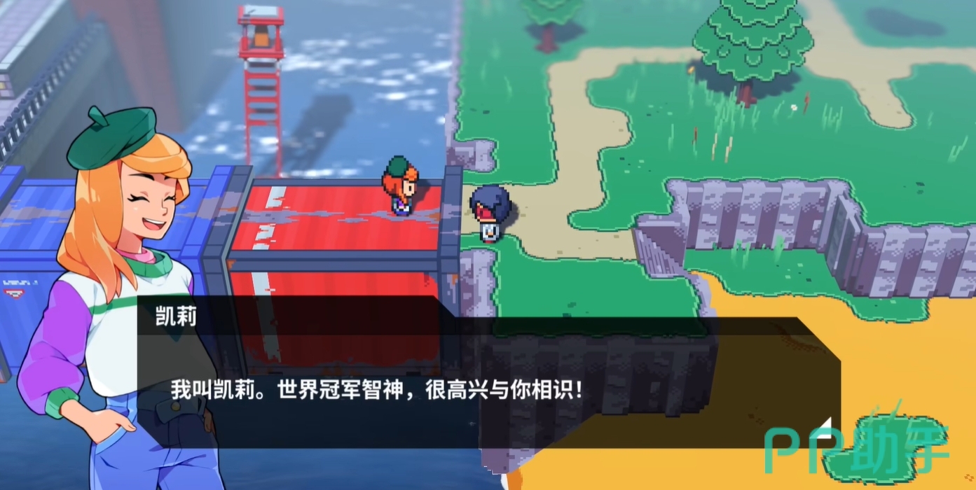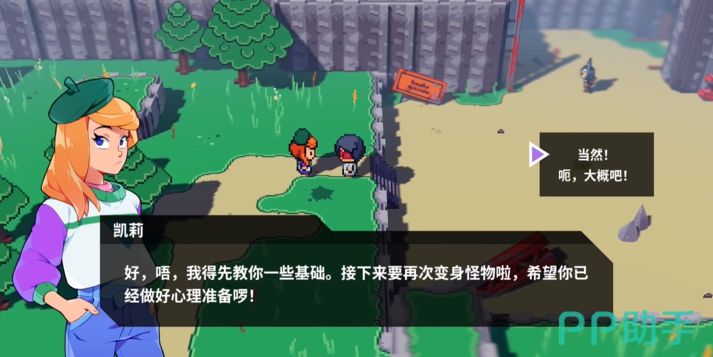当玩家刚来到游戏里的像素世界后,会在第一场战斗里遇到凯莉,得到自己的初始妖怪,完成战斗后便能跟随凯莉回到城镇。在通过一系列的剧情以及游戏世界观的解答后,玩家会与凯莉一同前往野外进行战斗和探索的教学,正式开启凯莉任务。