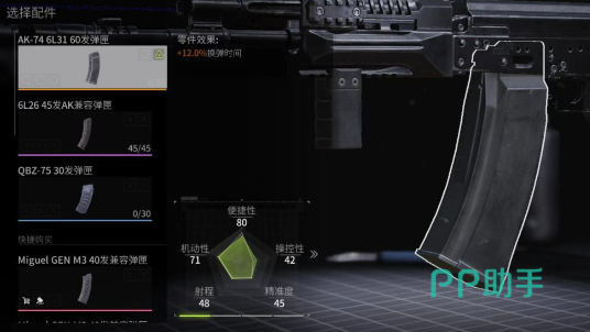 弹匣方面因为是满改,所以肯定越大的越好,直接使用最高的60发弹匣提高我们的作战容错率,后握把则是选择AK-12后握把,这个后握把能提高我们的耐力,同时也会子弹的精度有所加成。