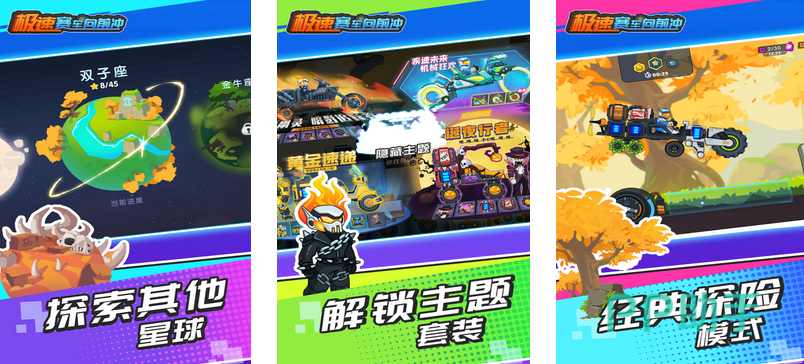 赛车种类众多,不仅有舒适的轿车,更有重在速度的跑车和超级跑车。在性能上,玩家不仅可以修理赛车达到加速性能,还可以通过改装操控赛车的行驶方向。赛道以星球为背景,玩家可探索双子座等多种行星赛道,并且解锁车型主题套装。普通赛车模式外,玩家还可以在经典的探险模式中操控赛车向前冲,此时优先选择多座位的赛车。