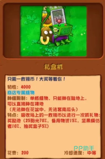 礼盒机听起来就像是个装满惊喜的盒子,而它也确实如此。不过它并不是那种一打开就能直接看到礼物的盒子,而是一个需要种植在草地上,通过吸收银币来“抓”礼物的特殊植物。礼盒机作为梦幻彩卡,只能在商店中购买,无法通过游戏中的随机机制获得。想象一下在激烈的僵尸大战中,玩家种下这样一株礼盒机,它就像是一个小型的抽奖机,每次吸收银币都会给玩家带来不一样的惊喜。这个礼盒机可不是随便什么地方都能种的。它只喜欢在陆地上生长,花盆里或者套个南瓜头都不行。所以在种植之前,玩家可得好好规划一下,找个合适的位置,让它能够安心地为玩家工作。