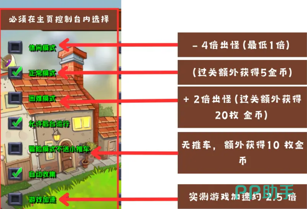 除了调整游戏难度,控制台还提供了其他一些非常实用的功能。比如,玩家可以选择允许游戏在后台运行,这样即使玩家暂时离开游戏去做其他事情,也不必担心游戏会被暂停。另外,如果玩家不喜欢冒险模式中赠送的小推车,也可以通过控制台来关闭这个功能。自动收集功能则是一个节省时间的利器。在游戏中,每当玩家的植物击败僵尸后,都会掉落一些金币或道具。如果玩家手动去收集这些物品,可能会浪费不少时间。而开启自动收集功能后,这些物品就会自动被收集到玩家的背包中,让玩家能够更专注于游戏的策略布局。