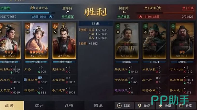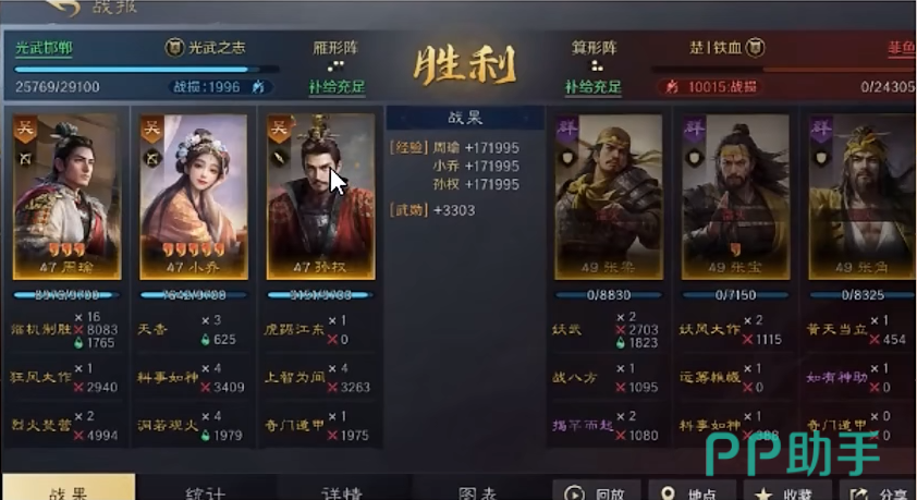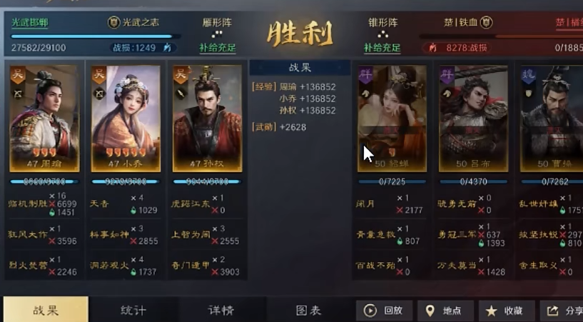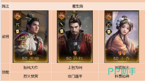 这套阵容主要的输出是周瑜和小乔,周瑜和小乔的羁绊在搭配上孙权能够提高整体队伍的主动战法的发动的概率率,提高输出条件以及输出效果,并且小乔的虚弱能够抵御80%的减伤,持续战斗结束不断的为对面敌人挂上虚弱的小bug,再发动攻击和胜利率非常大。