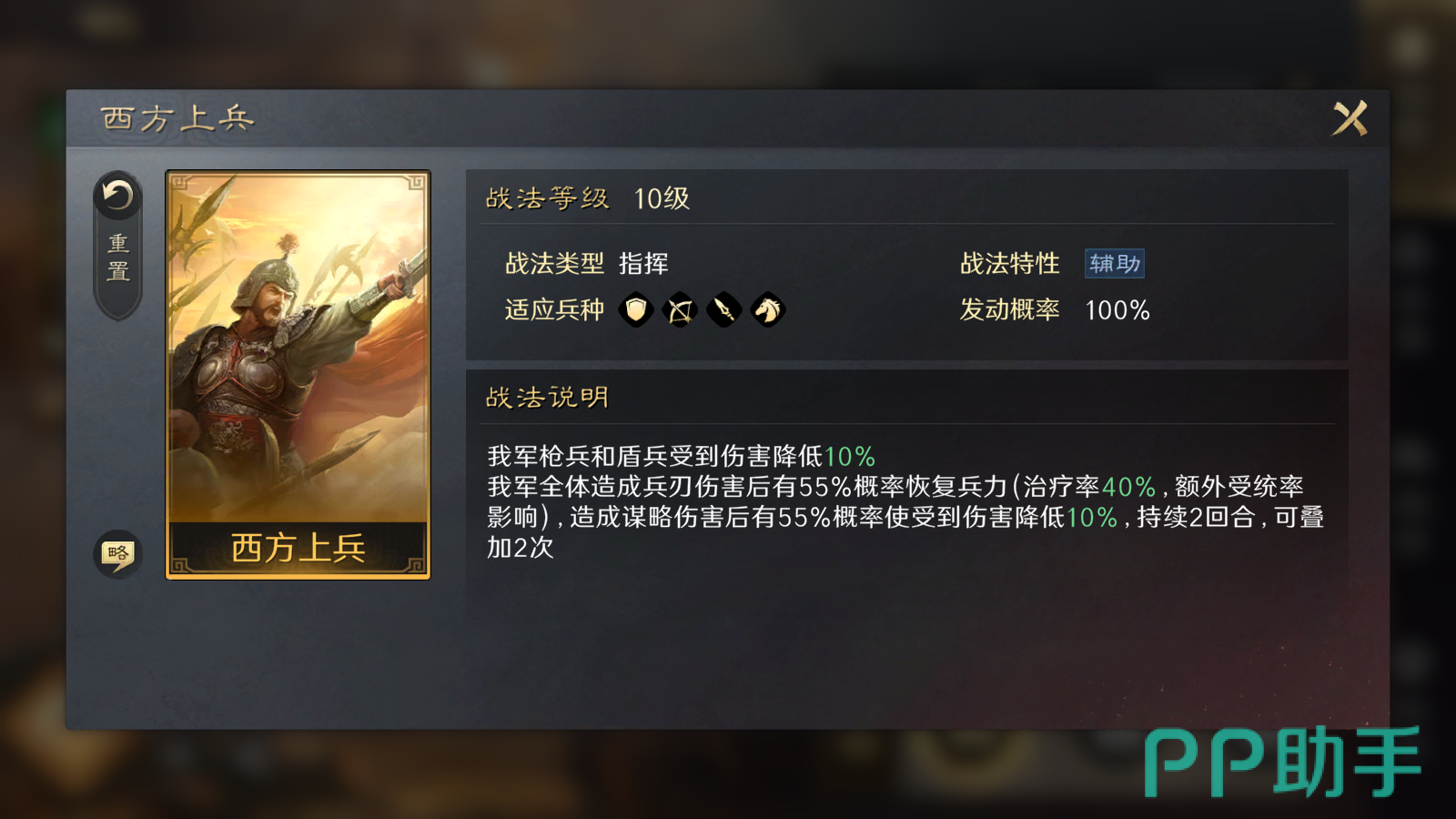 除此之外,这个技能能够对友军拥有治疗的效果,当友军受到兵刃的伤害之后,有一半的几率恢复兵力并且谋略伤害减少10%,该状态下能持续两个回合,并且可以叠加2次这个技能。让陈到这战斗中的受用面很广,能输出能增益。