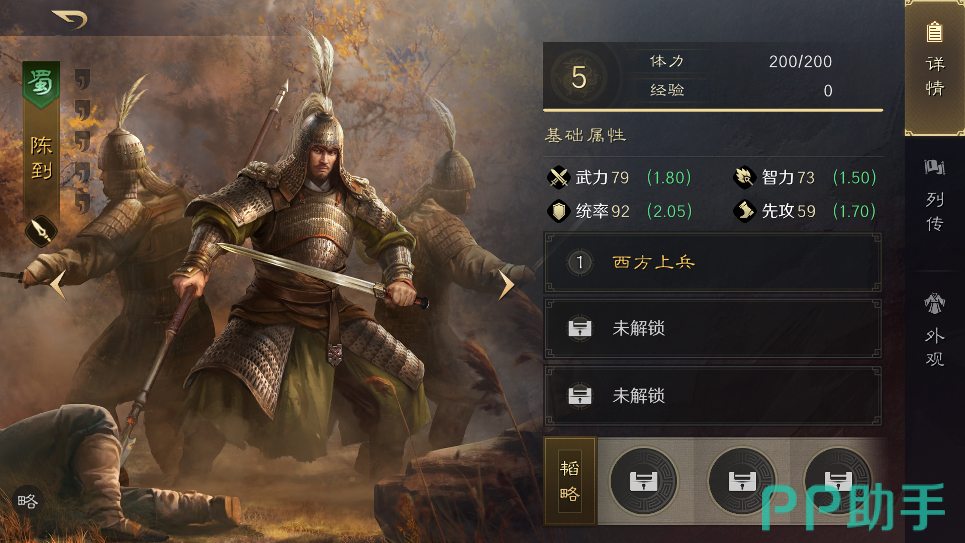 陈到的设定国家是蜀国,是一位黄色品质的枪冰兵武将。主要的职业是统帅,在阵容搭配中适合放置在前排抵御伤害。自带战法西方上兵就是陈到的技能, 该技能能够让我方友军受到的伤害减少10%,不过只能对枪兵和盾兵有效果。
