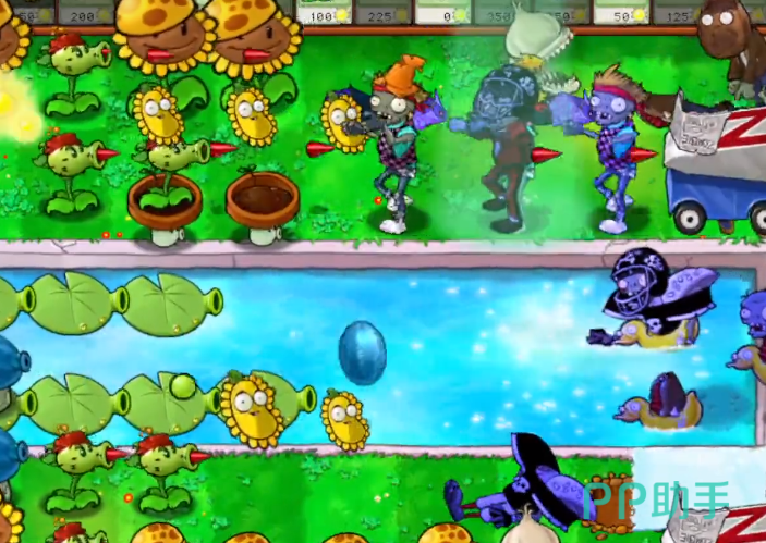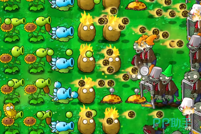 但是在这个游戏里,两者就会融合到一起,不管是黑夜模式还是白天模式,玩家都可以直接种植蘑菇向日葵产出阳光,不止向日葵,游戏里的其他植物也都融合了两种及以上的不同形态,最常见的就是坚果墙和原有的火焰树桩进行了融合,在这种状况下,坚果强依旧可以抵挡僵尸的进攻,同时火焰也可以持续不断的给僵尸带来灼烧的作用。